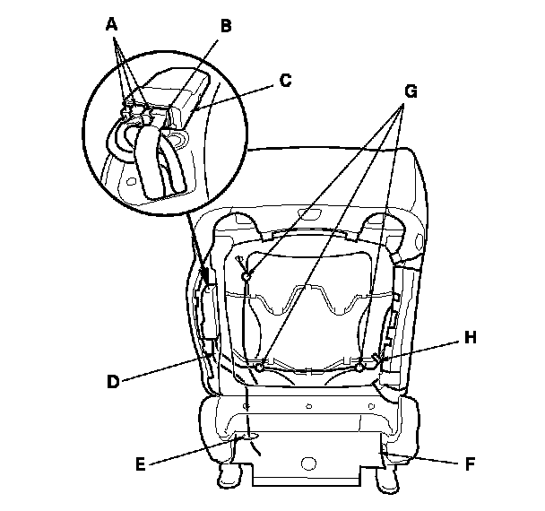 11. Passenger's seat: Disconnect the OPDS sensor connectors (A) and the ODS unit connector (B) from the ODS unit (C), and pull them in through the hole in the seat frame. Pull out the ODS subharness (D) through the harness hole (E) in the seat-back cover (F). Detach the harness clips (G), and remove the wire tie (H).