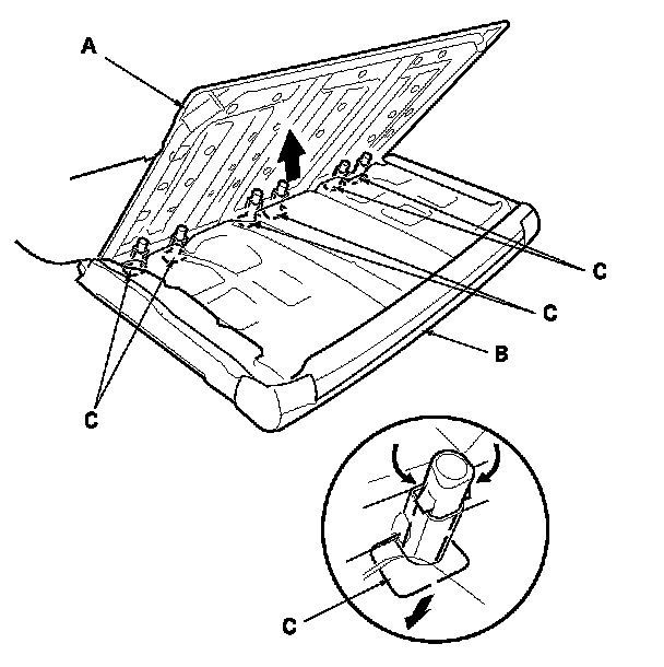 6. Pull out the seat-back frame (A) from the seat-back cover/pad (B), then pinch the tabs on the ends of the head restraint guides (C), and remove them from the seat-back.
