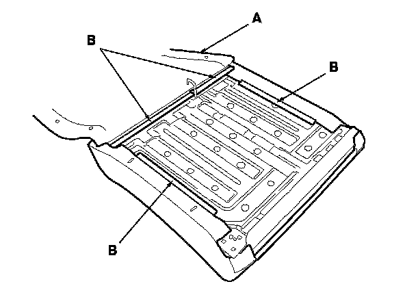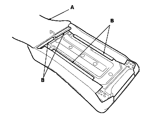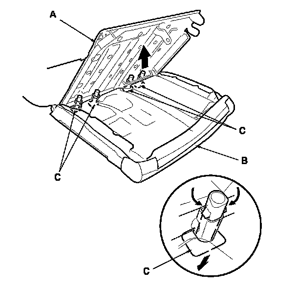 8. Pull out the seat-back frame (A) from the seat-back cover/pad (B), then pinch the tabs on the ends of the head restraint guides (C), and remove them from the seat-back. The left seat-back is shown; the right seat-back is similar.