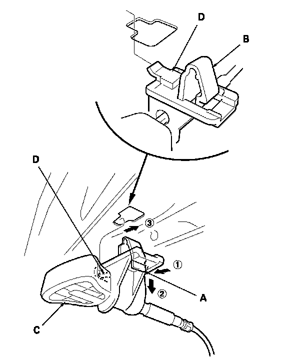 6. Install the release lever/cable in the reverse order of removal, and note these items:
