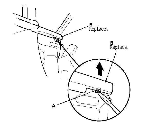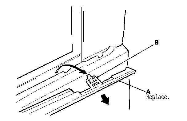 5. Twist the front door glass outer weatherstrip (A) to pull out the rear hook (B) from the inside of the door, then remove the weatherstrip.