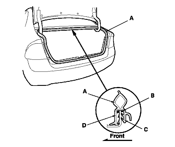 1. Remove the trunk lid weatherstrip (A) by pulling it off.