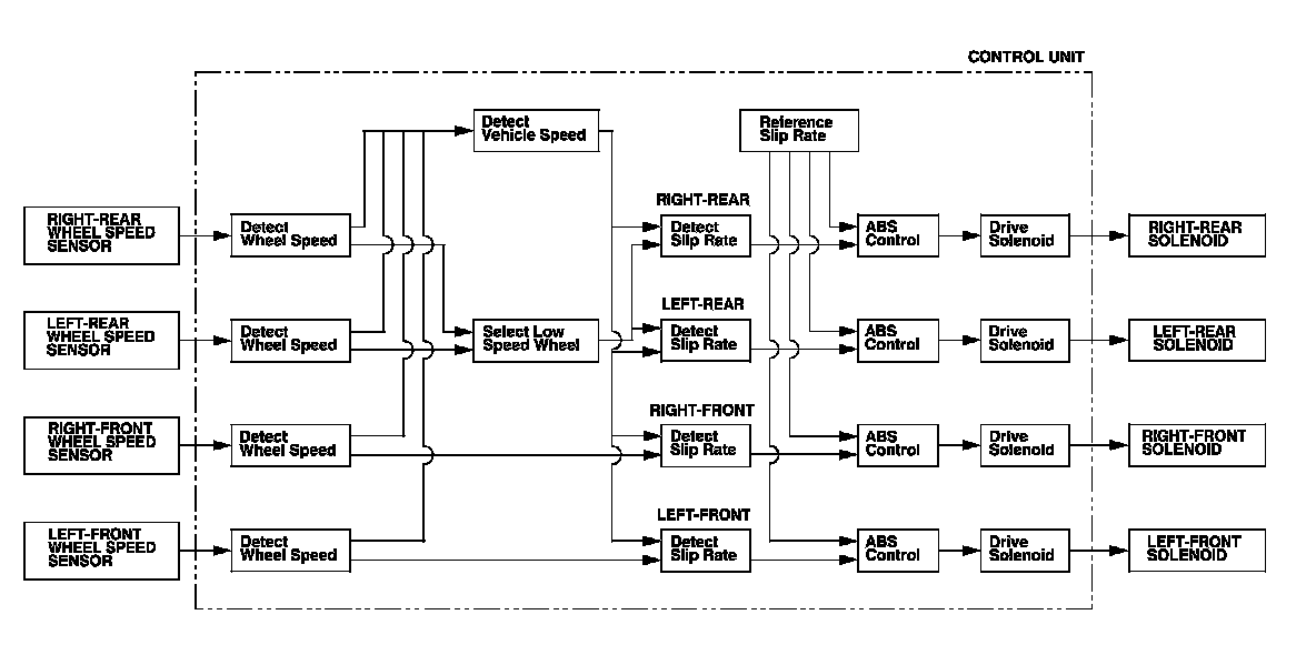 Without ABS, when the brake pedal is pressed while driving, the wheels sometimes lock before the vehicle comes to a stop. In such an event, the maneuverability of the vehicle is reduced if the front wheels are locked, and the stability of the vehicle is reduced if the rear wheels are locked, creating an extremely unstable condition. With ABS, the system precisely controls the slip rate of the wheels to ensure maximum grip force from the tires, and it thereby ensures maneuverability and stability of the vehicle. The ABS calculates the slip rate of the wheels based on the four wheel speeds, and then it controls the brake fluid pressure to reach the target slip rate.
