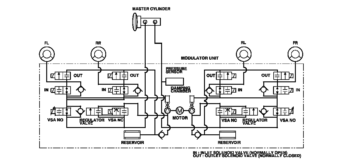 The modulator unit consists of the inlet solenoid valve, the outlet solenoid valve, the VSA NO (normally open) solenoid valve, the VSA NC (normally closed) solenoid valve, the reservoir, the pump, the pump motor, and the damping chamber.