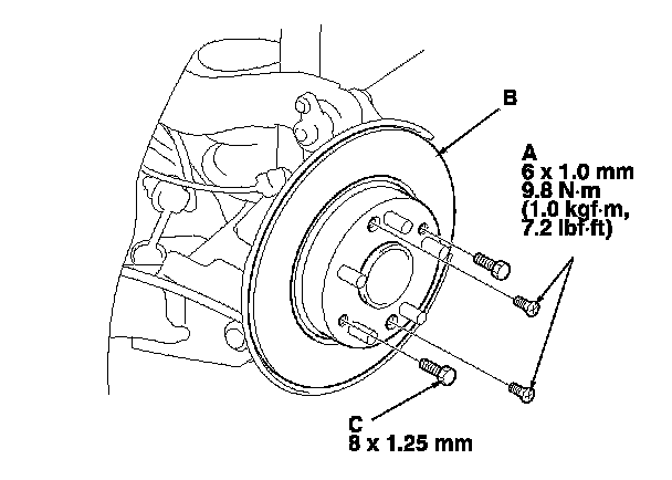 NOTE: If the brake disc is stuck to the hub bearing unit, thread two 8 x 1.25 mm bolts (C) into the brake disc to push it away from the hub bearing unit. Turn each bolt 90 degrees at a time to prevent the brake disc from binding.