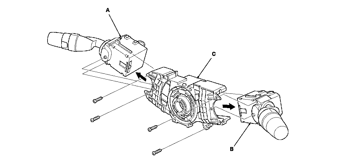 4. Remove the combination light switch (A) and the wiper/washer switch (B) from the combination switch body assembly (C).