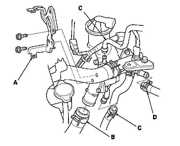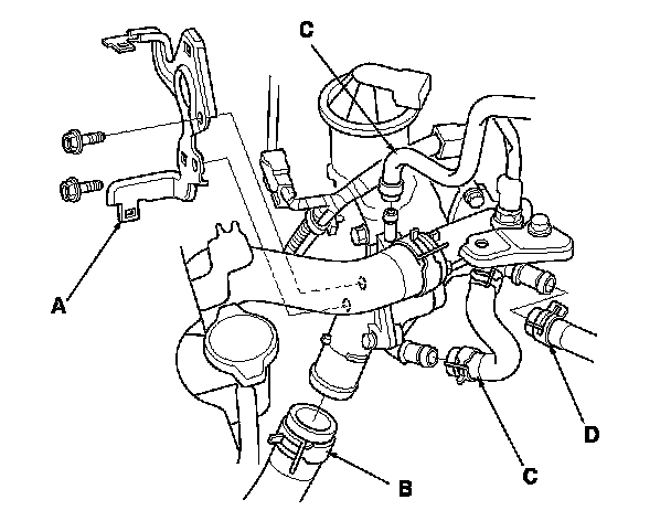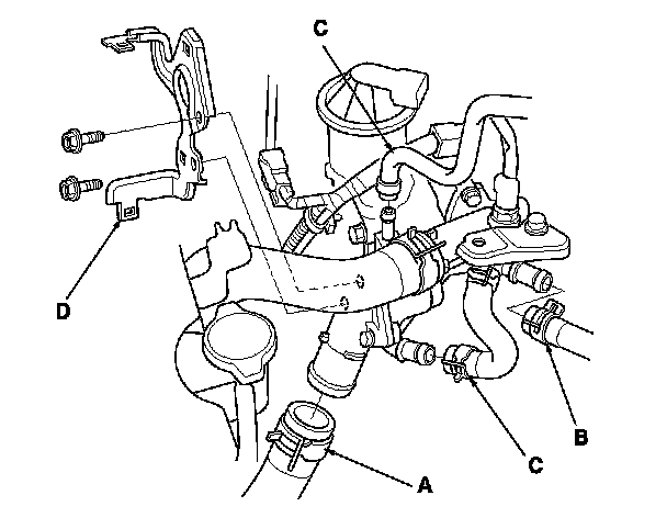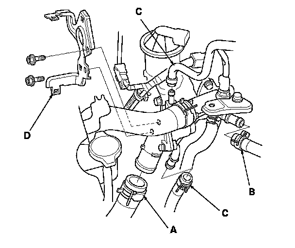 3. Remove the harness bracket (A), and cover the air fuel ratio (A/F) sensor connector and secondary heated oxygen sensor (secondary HO2S) connector with tape to protect the connectors from engine coolant, then disconnect the lower radiator hose (B), the water bypass hose (C), and the heater hose (D).