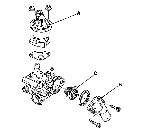 7. Remove the EGR valve (A), the thermostat cover (B), and the thermostat (C).