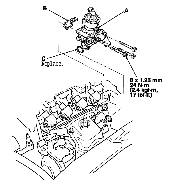 2. Install the EGR valve (E) with a new gasket (F).