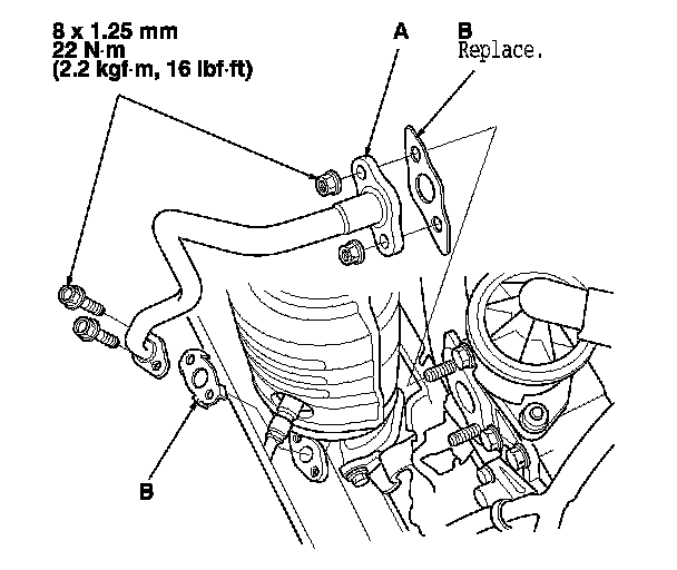 5. Install the EGR pipe (A), using the new gaskets (B).