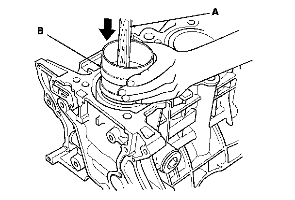 Push down on the ring compressor (B) to prevent the rings from expanding before entering the cylinder bore.