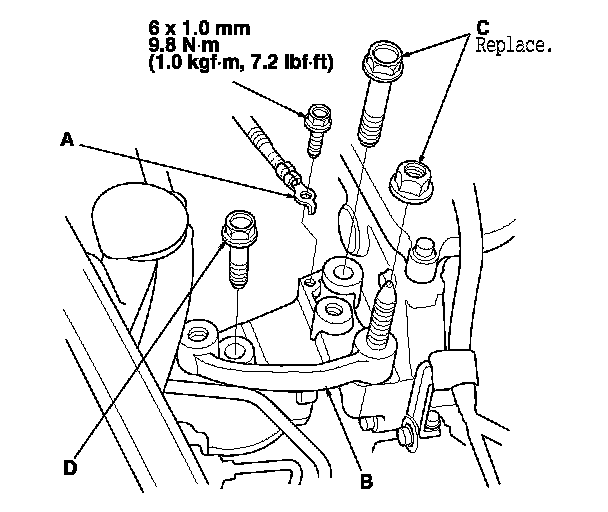 4. Install the side engine mount bracket, loosely tighten the new bolt and nut (C), then loosely tighten the bolt (D).