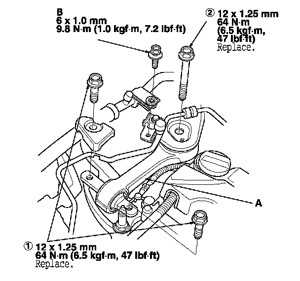 2. Remove the bolt (A) securing the A/C line, then remove the upper torque rod (B).