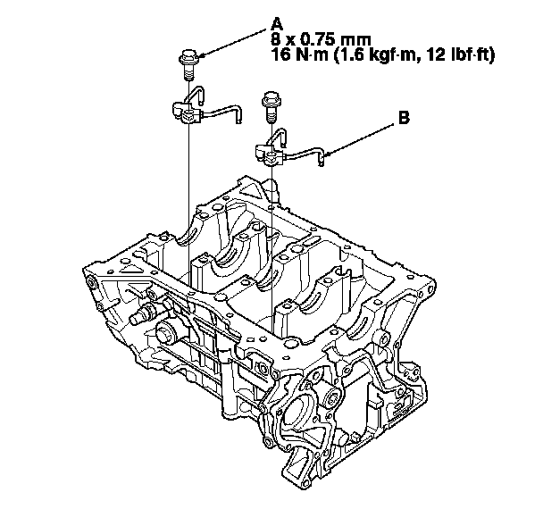 2. Remove the oil jet bolts (A), then remove and discard the oil jets (B).