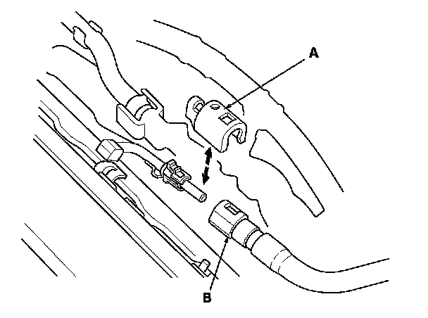 8. Remove the quick-connect fitting cover (A), then disconnect the fuel feed hose (B). Fuel Line/Quick-Connect Fitting Removal