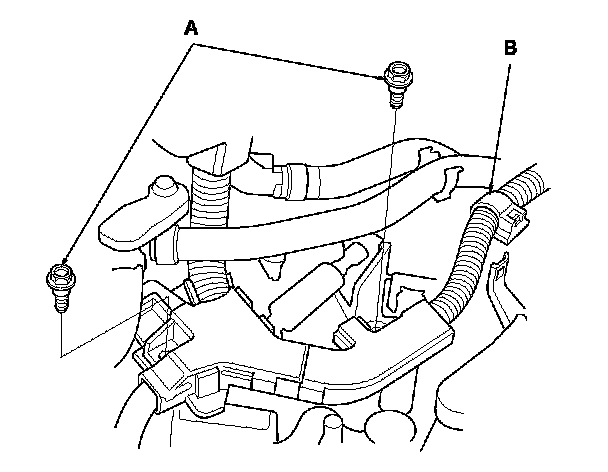 12. Remove the engine control module (ECM)/ powertrain control module (PCM) cover (A), then remove the three bolts (B) securing the ECM/PCM.