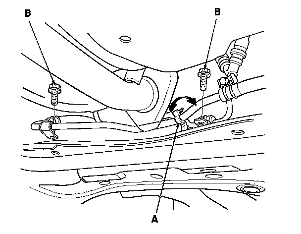 32. Hydraulic power steering model: Unclamp the power steering fluid line clamp (A) on the front subframe, and remove the P/S line mounting bolts (B).
