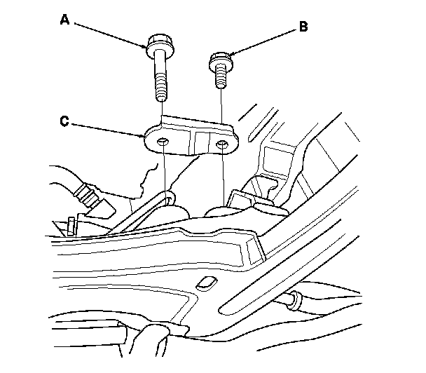 33. Hydraulic power steering model: Remove the steering gearbox mounting bolt (A), the stiffener mounting bolt (B), and the stiffener (C).