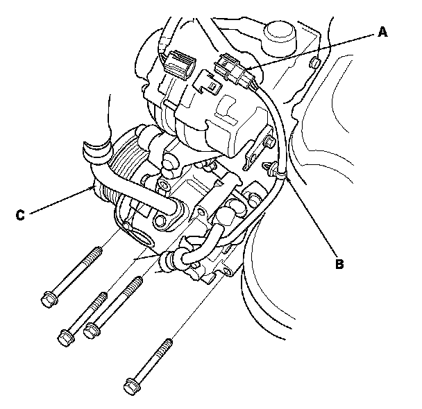 43. Remove the A/C compressor (C) without disconnecting the A/C hoses.