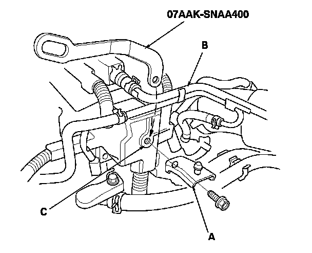 9. Disconnect the evaporative emission (EVAP) canister hose (A) and the brake booster vacuum hose (B), and remove the power steering (P/S) hose clamp (C).