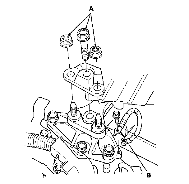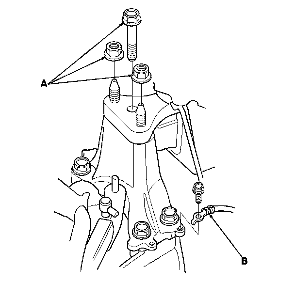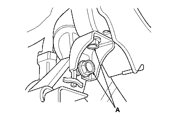61. Remove the transmission mount bracket mounting bolt and the nuts (A).