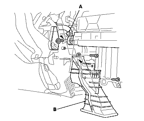 2. Remove the wire harness clip (A), the self-tapping screws, and the passenger's heater duct (B).