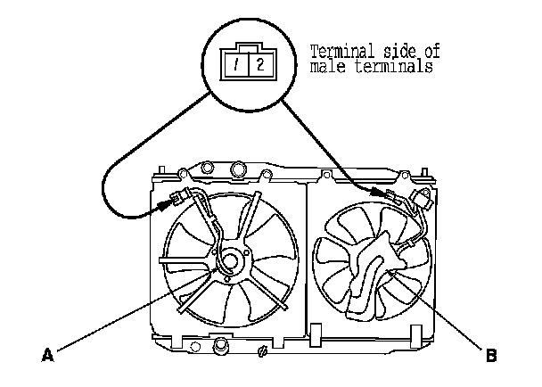 1. Disconnect the 2P connectors from the radiator fan motor (A) and the A/C condenser fan motor (B).