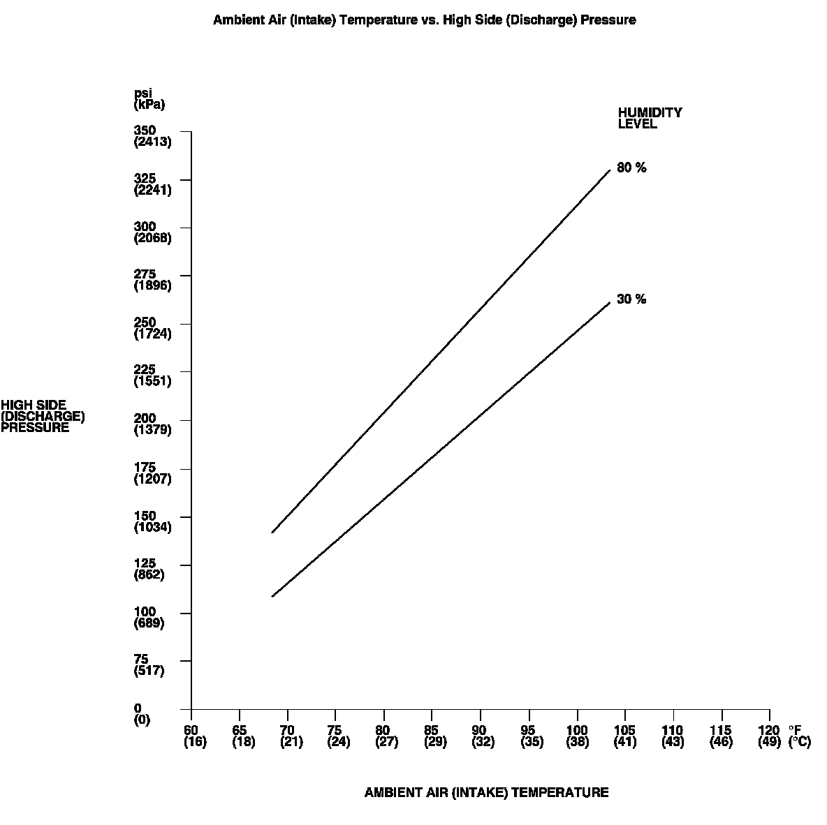 NOTE: The high side pressure and the ambient air temperature should intersect in the shaded area. Any measurements outside the line may indicate the need for further inspection.