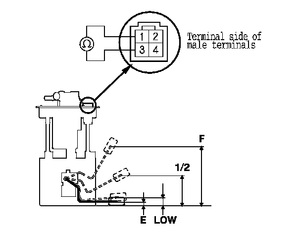 11. Measure the resistance between fuel tank unit 4P connector terminals No. 1 and No. 3 with the float at E (EMPTY), LOW (LOW FUEL INDICATOR), 1/2 (HALF FULL), and F (FULL) positions.