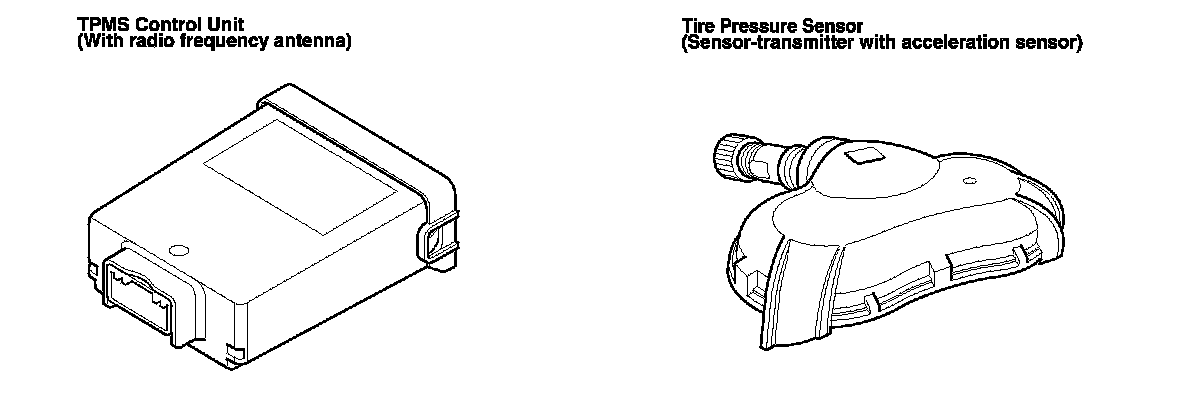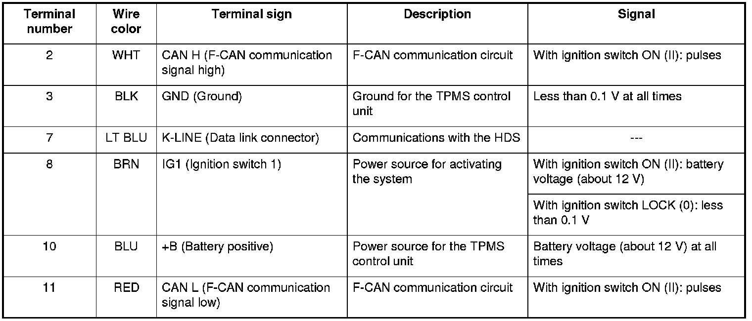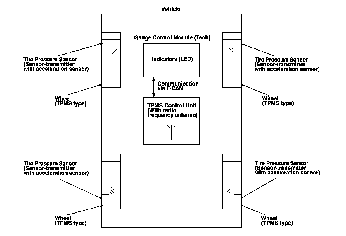 - When the vehicle is traveling more than 28 mph (45 km/h), an RF (radio frequency) band wave signal is transmitted from each tire pressure sensor to the TPMS control unit.