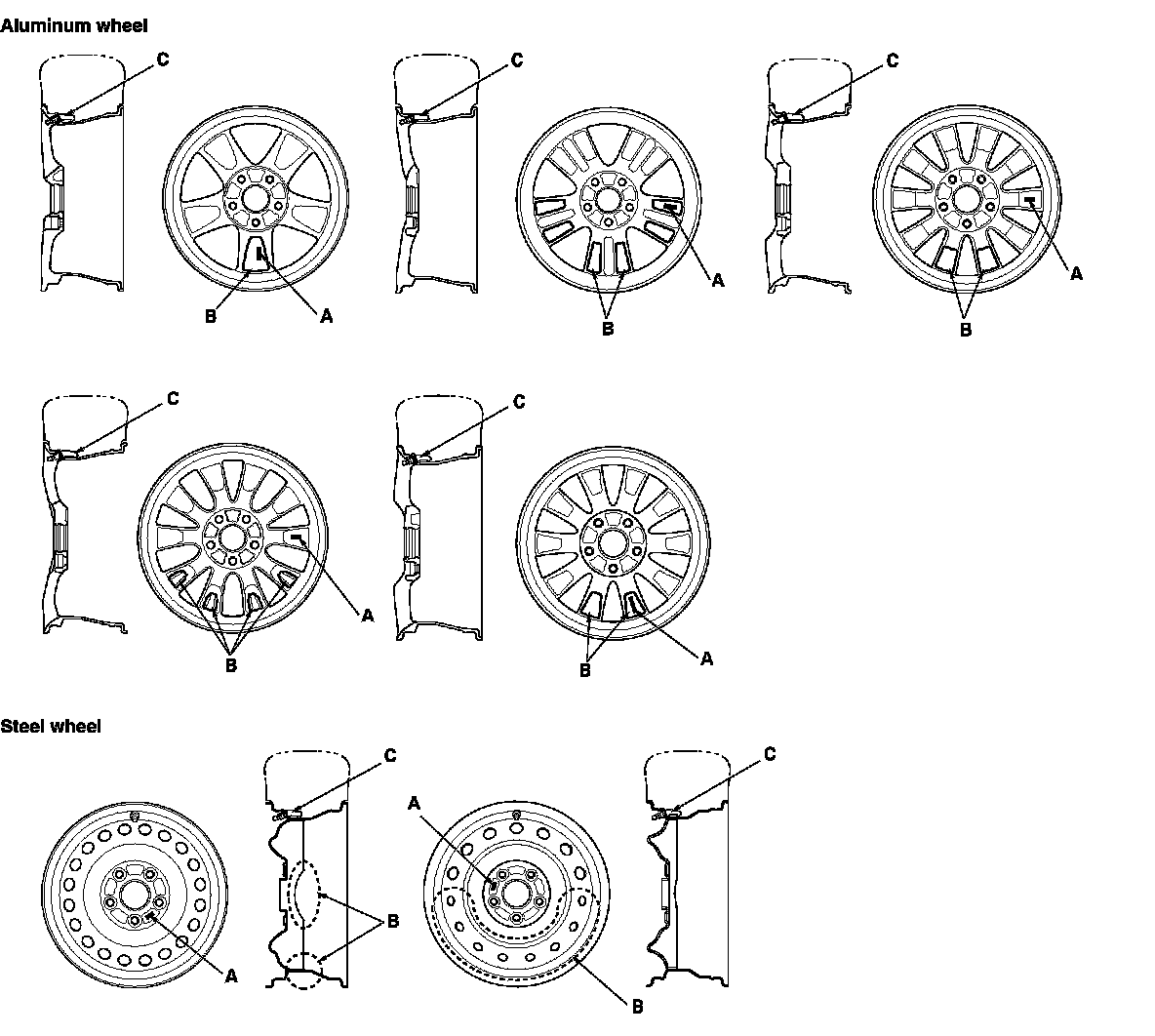 The TPMS will not work unless TPMS type wheels are installed on the vehicle. There are seven different types of wheels used. The original equipment wheels have a "TPMS" mark (A) on them and are counterweighted (B) the opposite of the tire pressure sensor (C), to counterbalance the weight of the sensor.