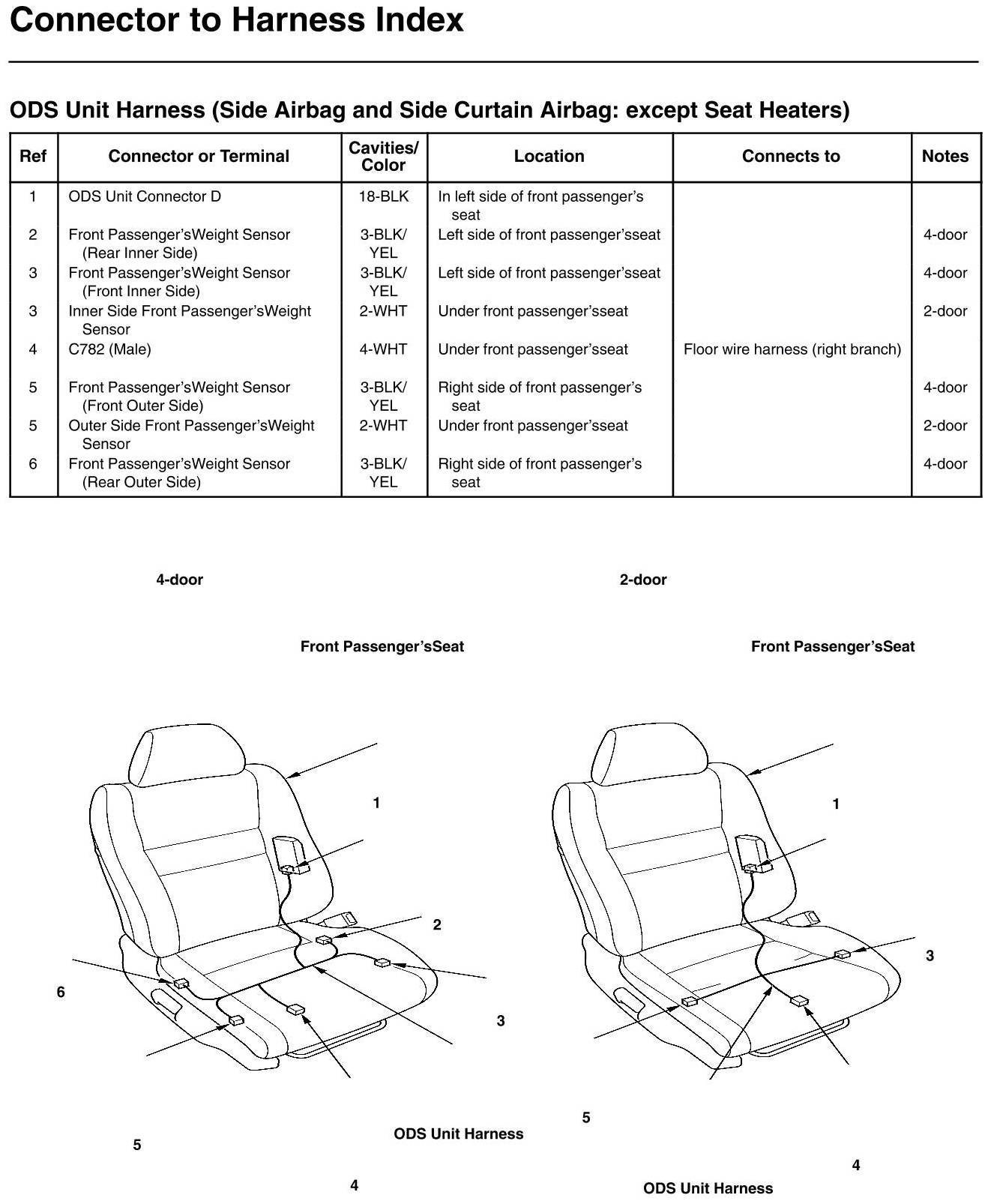 ODS Unit Harness Connector And Harness Locations (Except Seat Heaters)