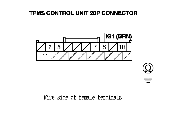 9. With the No. 10 (7.5 A) fuse removed, check for continuity between body ground and TPMS control unit 20P connector terminal No. 8.