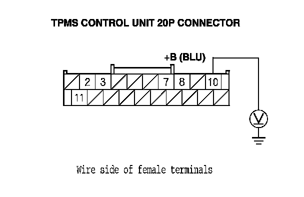 14. Measure the voltage between body ground and TPMS control unit 20P connector terminal No. 10.