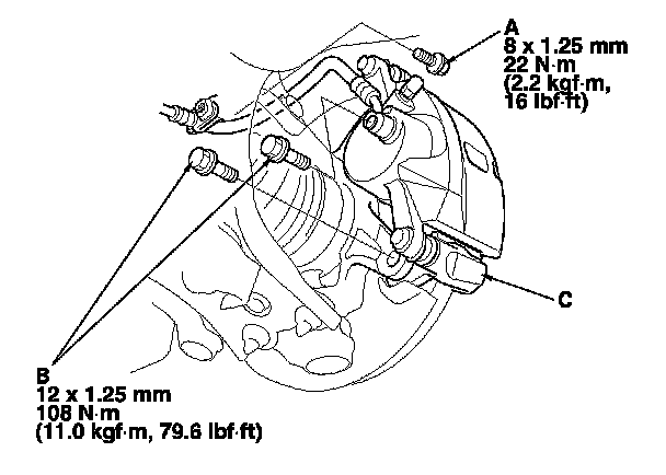 4. Remove the brake caliper bracket mounting bolts (B), then remove the caliper assembly (C) from the knuckle. To prevent damage to the caliper assembly or the brake hose, use a short piece of wire to hang the caliper assembly from the undercarriage. Do not twist the brake hose excessively.