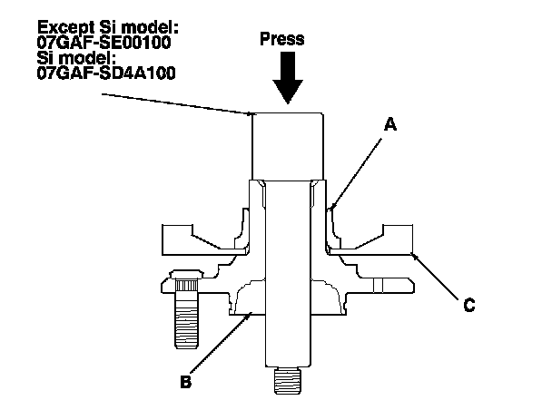 3. Press the wheel bearing inner race (A) off of the hub (B) using the hub dis/assembly tool, a commercially available bearing separator (C), and a press.
