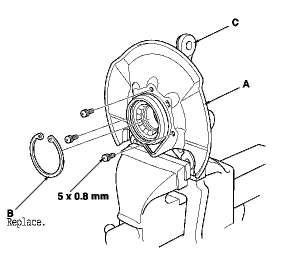 4. Remove the splash guard (A) and the snap ring (B) from the knuckle (C).