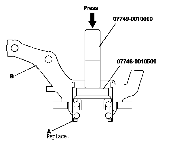 5. Press the wheel bearing (A) out of the knuckle (B) using the attachment, the driver handle, and a press.