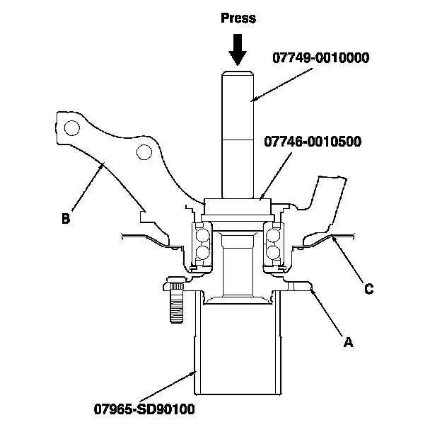 10. Install the hub (A) onto the knuckle (B) using the attachment, the driver handle, the support base, and a hydraulic press. Be careful not to damage the splash guard (C).