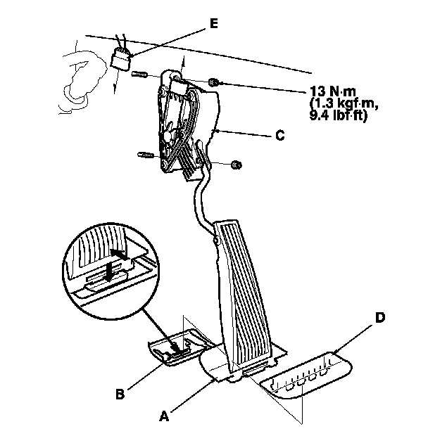 3. Push the tab (C), and remove the accelerator pedal pad (D) from the pedal stop (E).
