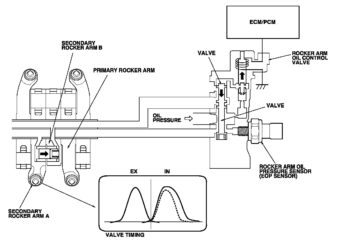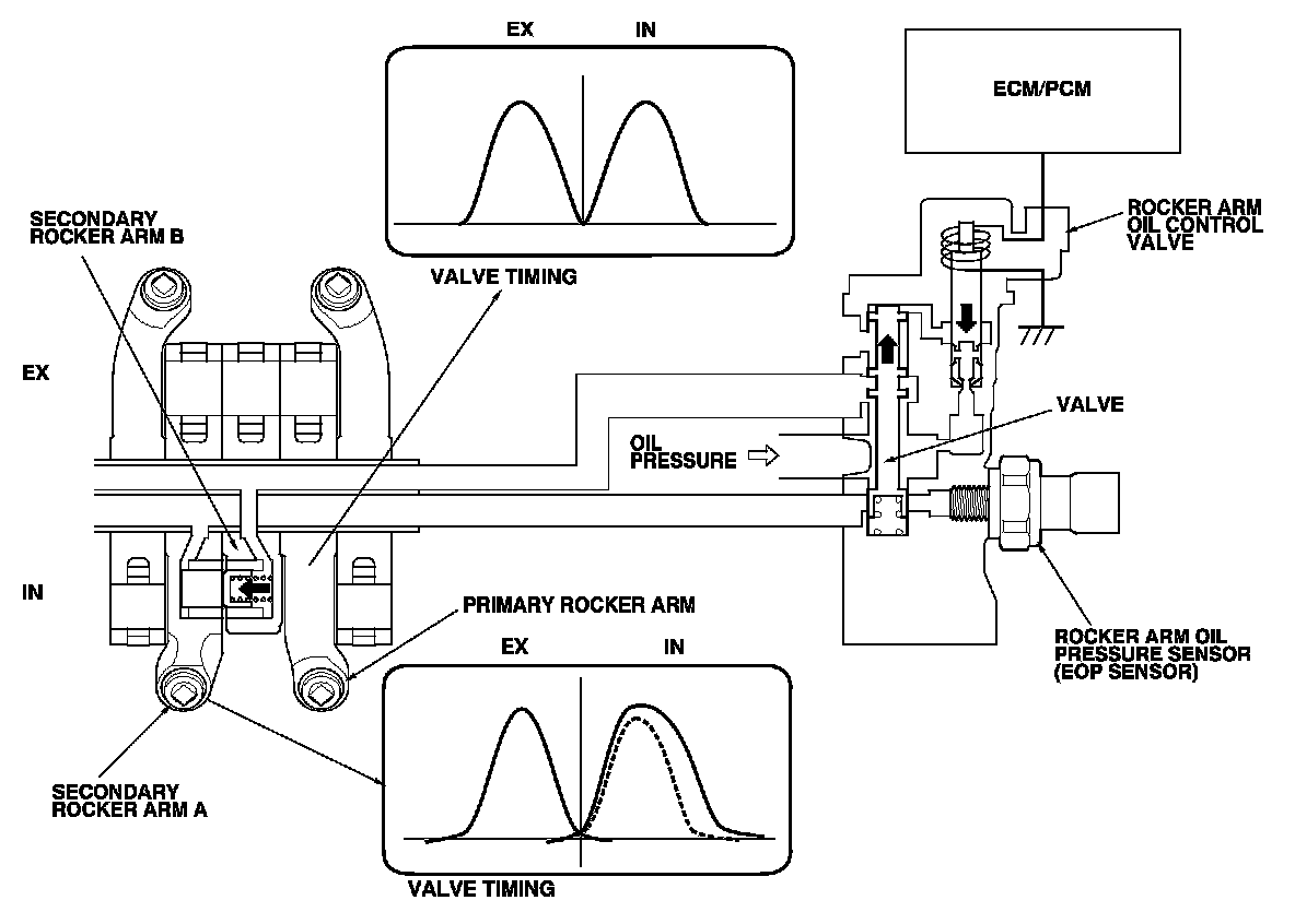 The rocker arm oil control valve switches oil pressure to the oil passage in the intake rocker arm shaft. Oil pressure then enters secondary rocker arm A, and it moves the VTEC switching piston in the rocker arm.