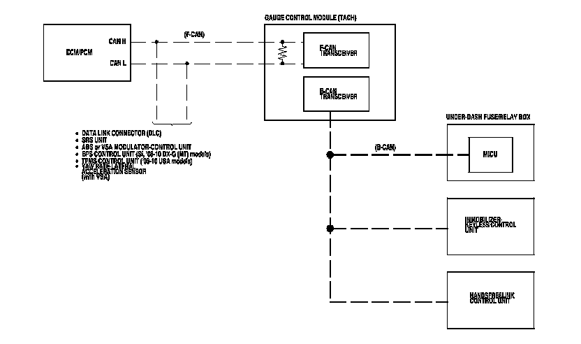 The body controller area network (B-CAN) and the fast controller area network (F-CAN) share information between multiple electronic control units (ECUs). B-CAN communication moves at a slower speed (33.33 kbps) for convenience related items and for other functions. F-CAN information moves at a faster speed (500 kbps) for "real time" functions such as fuel and emissions data. To allow both systems to share information, the gauge control module translates and relays the information from B-CAN to F-CAN and from F-CAN to B-CAN. This is called the Gateway Function.