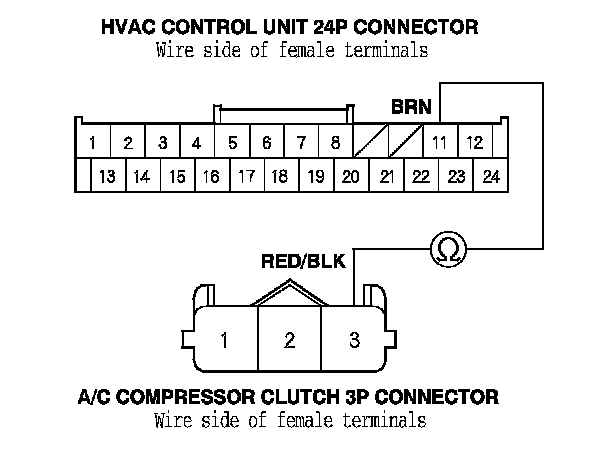 K20Z3 engine: Check for continuity between HVAC control unit 24P connector terminal No. 11 and A/C compressor clutch 3P connector terminal No. 3.