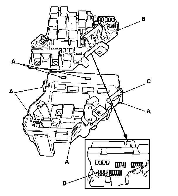 5. Turn the housing over again. Using two flat-tip screwdrivers, release the tabs (A), and pry up the fuse/relay box base (B) from the fuse/relay box housing (C).