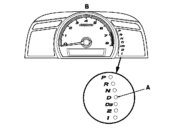 When the powertrain control module (PCM) senses an abnormality in the input or output system, the D indicator (A) in the gauge control module (tach) (B) will usually blink.