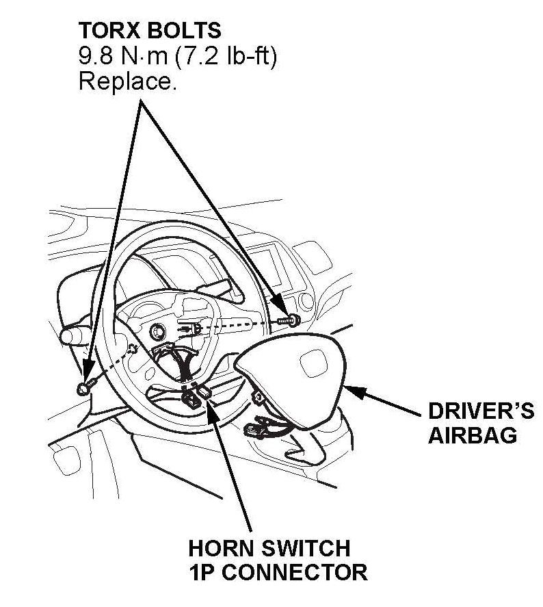 ^ Disconnect the horn switch IP connector, then remove the driver's airbag.