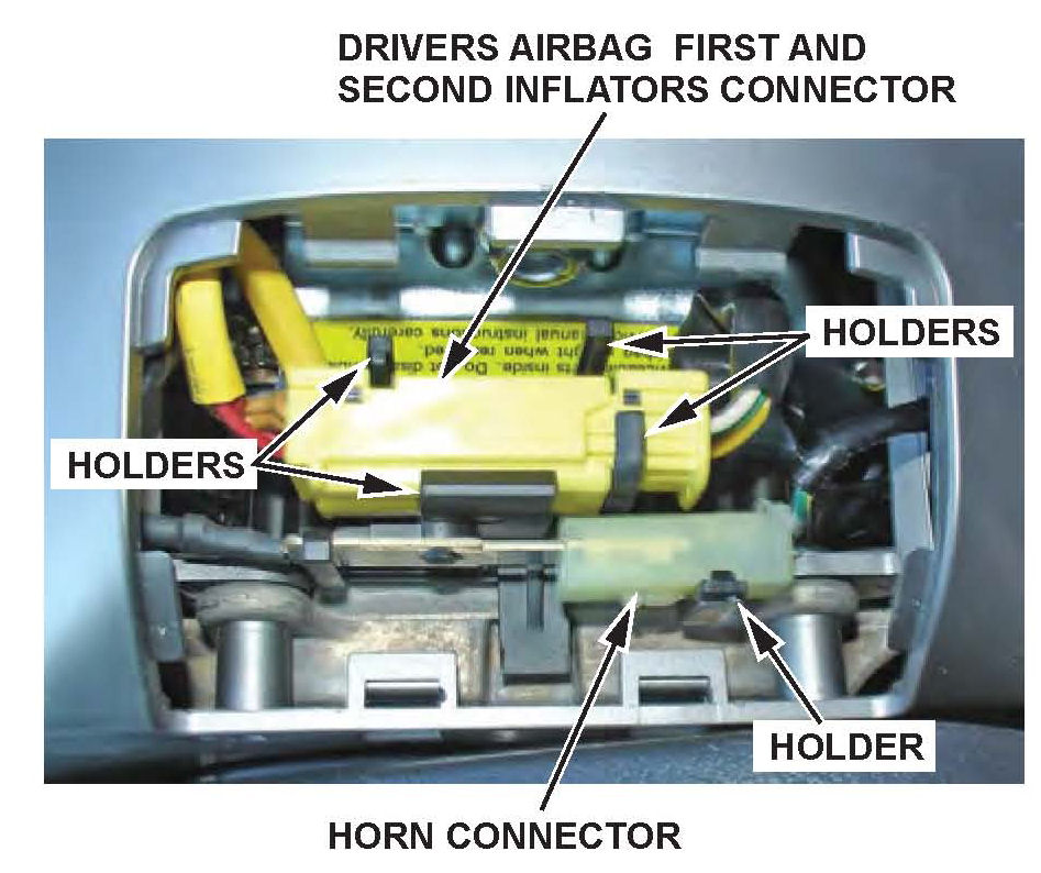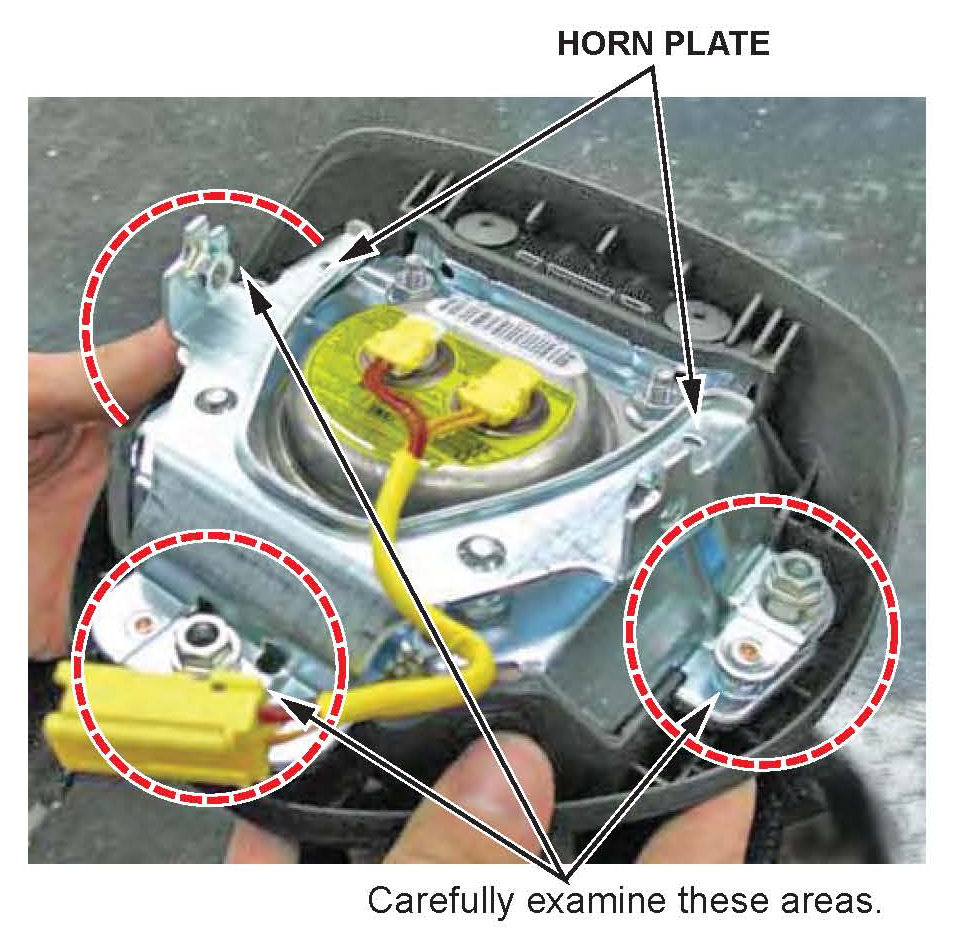 4. Inspect the driver's airbag for any signs of metal contamination; pay close attention to the horn plate. Carefully remove any metal contamination.