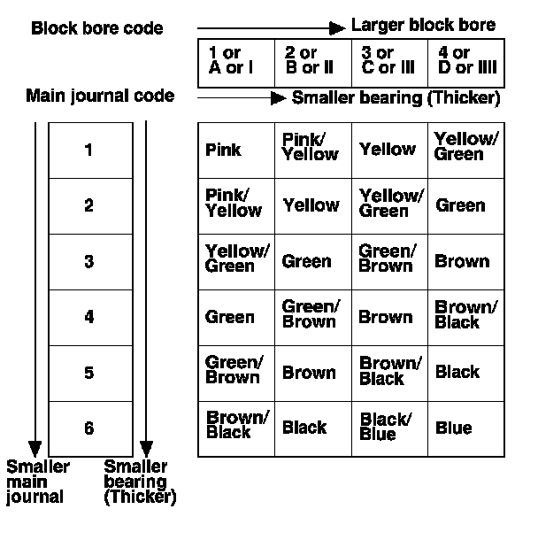 3. Use the block bore codes and the main journal codes to select the appropriate replacement bearings from the following table.