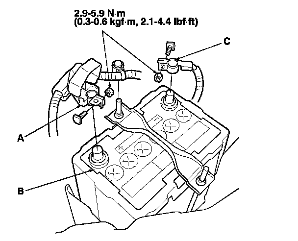 3. Reconnect the positive cable (A) to the battery (B) first, then reconnect the negative cable (C) to the battery.