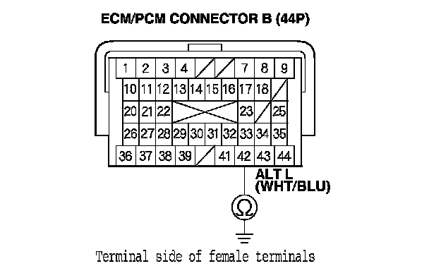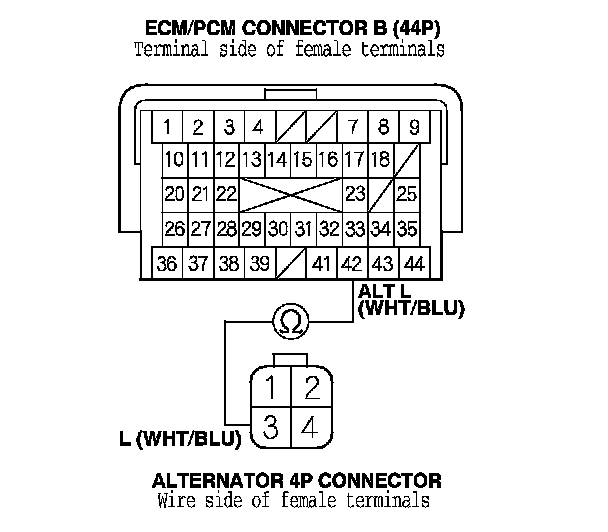 25. Check for continuity between ECM/PCM connector terminal B42 and alternator 4P connector terminal No. 3.